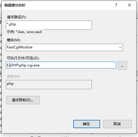 接来下为IIS添加映射,模块我们选择FastCgiModule,执行文件就选择PHP目录下的php-cgi.exe