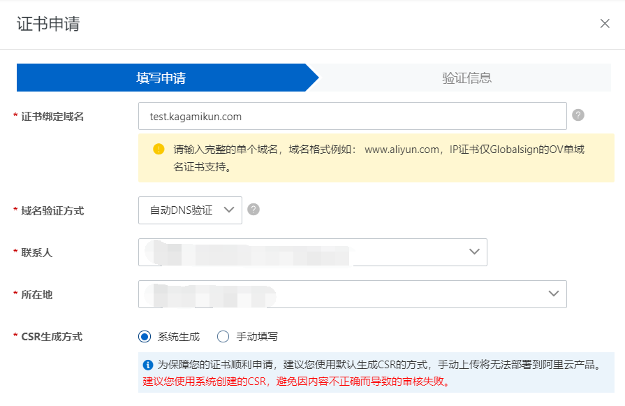 4.点击验证和申请审核后,基本过一会审核就会通过,记录你得到的证书信息,去域名解析添加解析内容