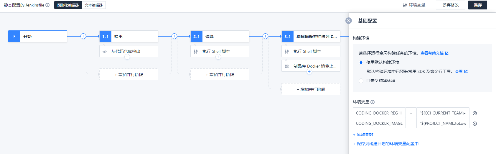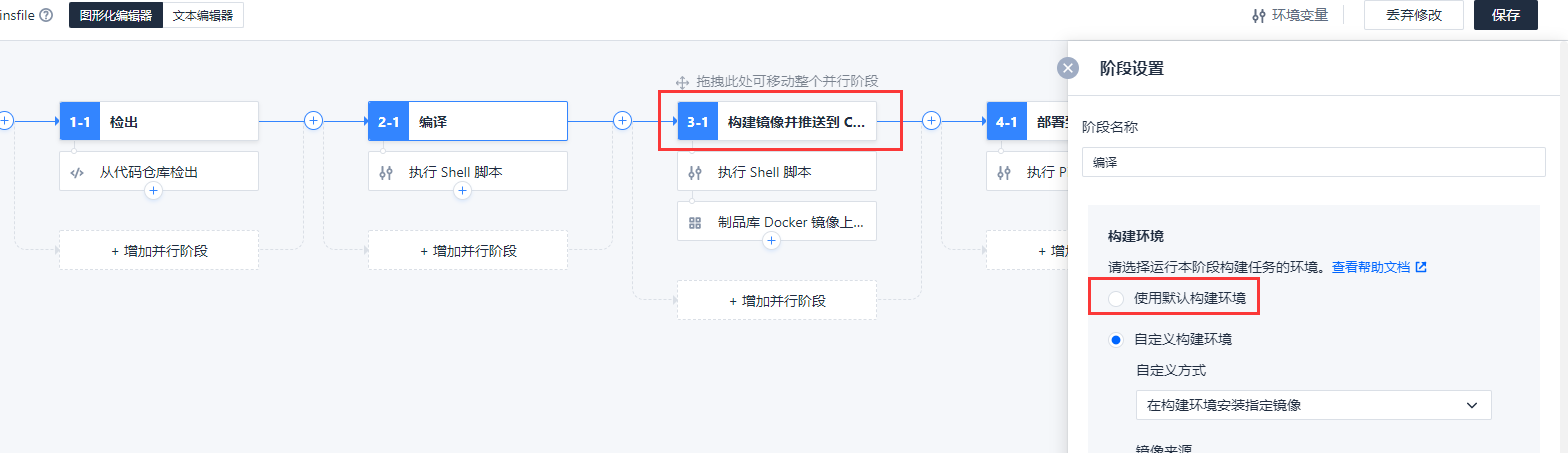 第一步需要先确认我们每个步骤的构造环境,因为流程安排是编译完打包镜像远程推送的,所以全部选择默认构造环境就行